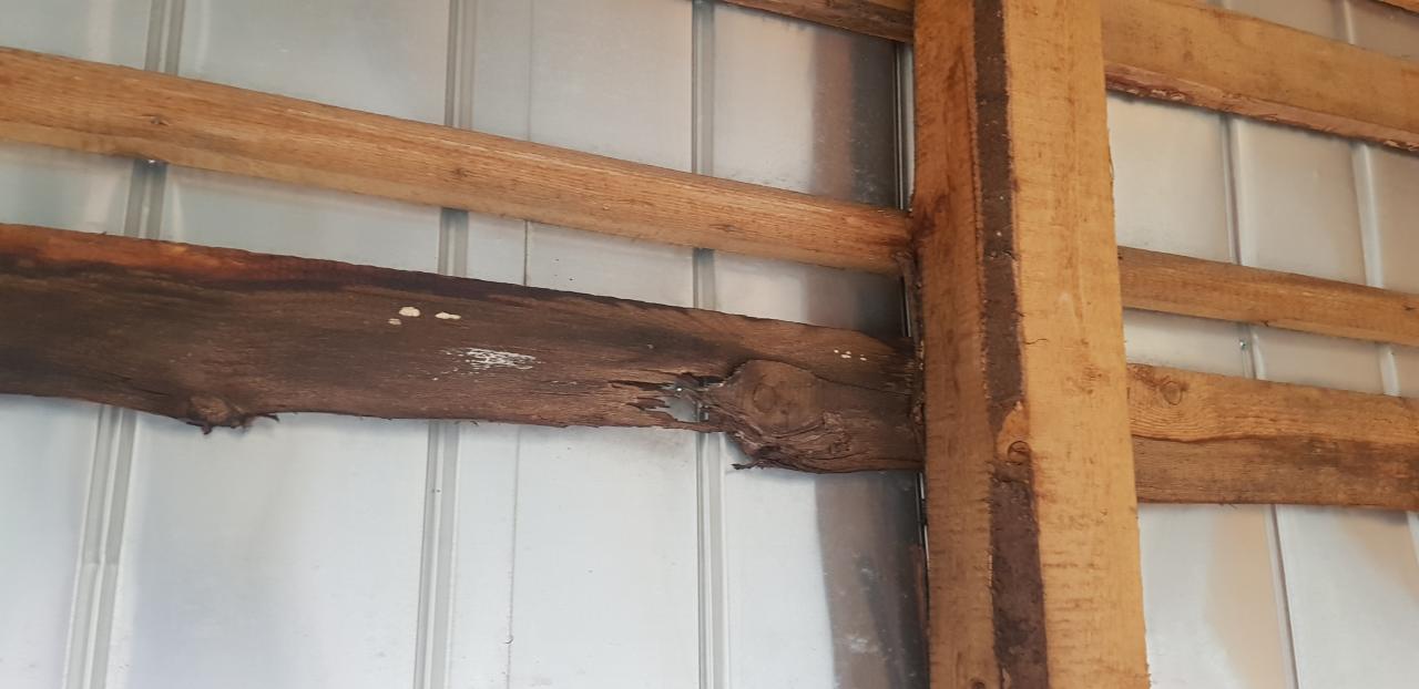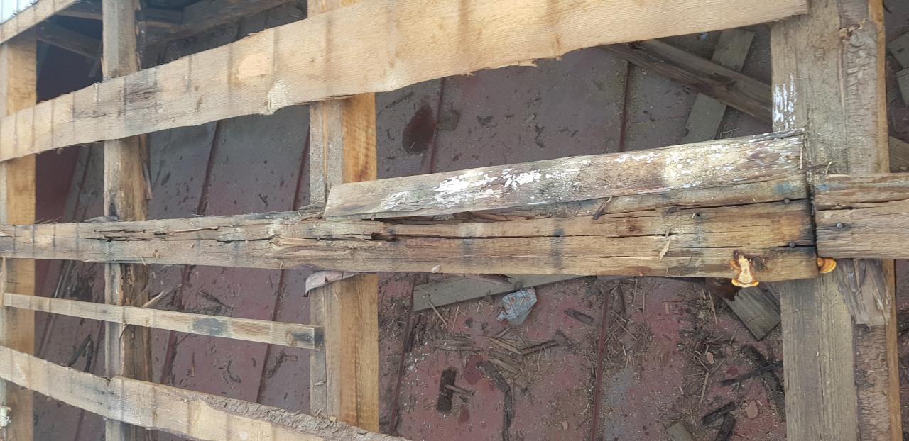 Poškodenie konštrukcie krovu na fotografiách je spôsobené dlhoročným zatekaním vody cez krytinu, ktoré síce zatiaľ nespôsobovalo žiadne viditeľné škody v interiéri budovy, ale ničilo konštrukciu krovu, zvlášť strešných lát i niektorých krokiev a nosníkov. Hrozilo, že pri ďalšom postupe „prhnutia“ drevenej konštrukcie krovu by mohlo dôjsť k zborteniu strechy.
