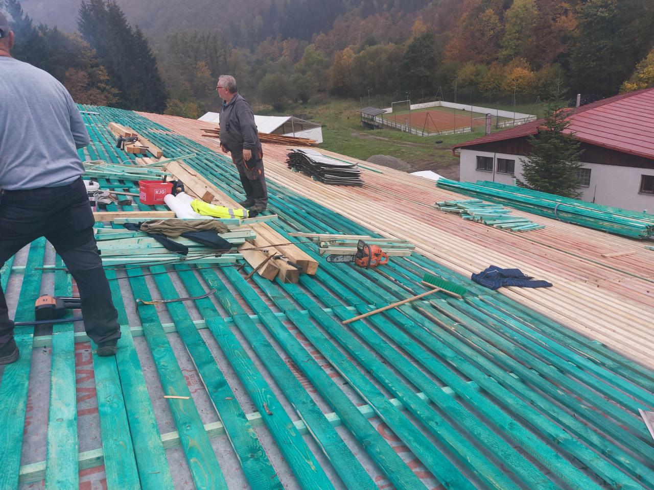 Zároveň sme zabezpečili dostatočné množstvo reziva na výmenu a posilnenie krokiev a na položenie nových lát pod krytinu. Tieto laty sme zároveň zahustili a použité rezivo sme natreli ochranným náterom. Na cedlú plochu sme použili ochrannú fóliu – parozábranu.
